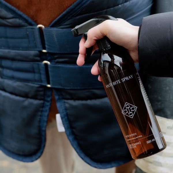 Shake the bottle well before use. Spray Bite Stop Spray evenly on bite-sensitive areas such as blankets, bandages, stable doors, and the horse's mane or tail. Allow the spray to dry before letting the horse access the treated object. Reapply regularly as needed, especially after heavy rain or cleaning.