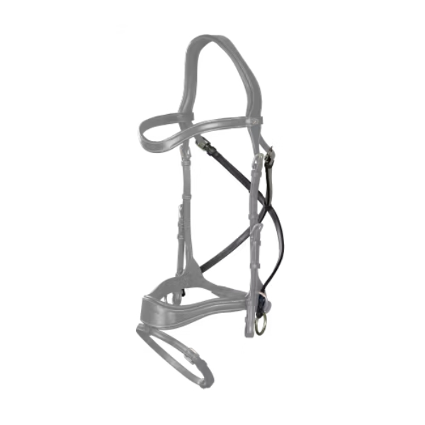Cross pull straps are for the D Motion bridle. They pass through the D buckles of the noseband, cross under the throat and attach to the throatlatch of the D Motion headpiece to ride in Cross Pull mode. Once in place, the reins can be attached to the rings of the cross pull straps.