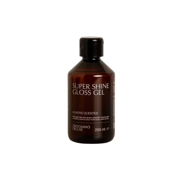 The Grooming Deluxe Super Shine Gloss Gel is the ultimate solution for a flawless mane and tail presentation, designed to meet all the needs for show, competition, or any special event. This premium gel provides exceptional detangling and conditioning properties, leaving hair silky soft with a fresh almond scent. Formulated with a micro water-oil emulsion, it dries quickly, repels dirt and urine, and leaves no greasy residue. Enjoy effortless grooming with added volume, a beautiful shine, and a long-lasting effect that’s easy to comb and braid.