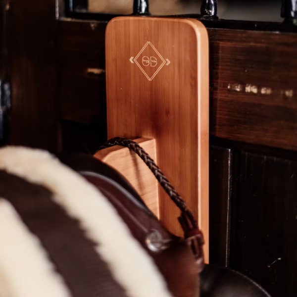 Make sure to get the best equipment for your tack room with this Saddle Rack! It is made out of bamboo which makes it extra resistant and easy to clean. It gives you space to hang 2 saddles or saddle pads. It is very easy to hang anywhere thanks to the large hook at the back. The golden Grooming Deluxe logo gives this rack a classy look. Combine style and organization for all your products with this fancy Saddle Rack!
